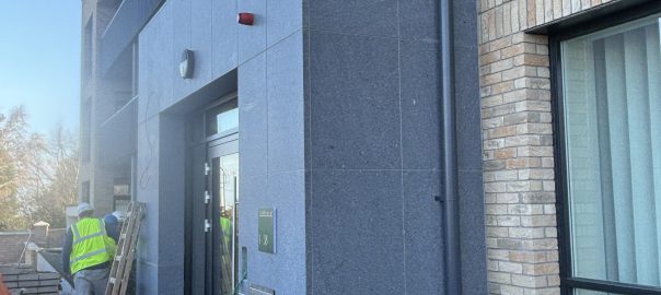40mm honed finished Negro Coa Granite from Portugal has been used for the entrance to the Fernhill Gate apartments in Dublin 18. Another repeat order from Brian Green.